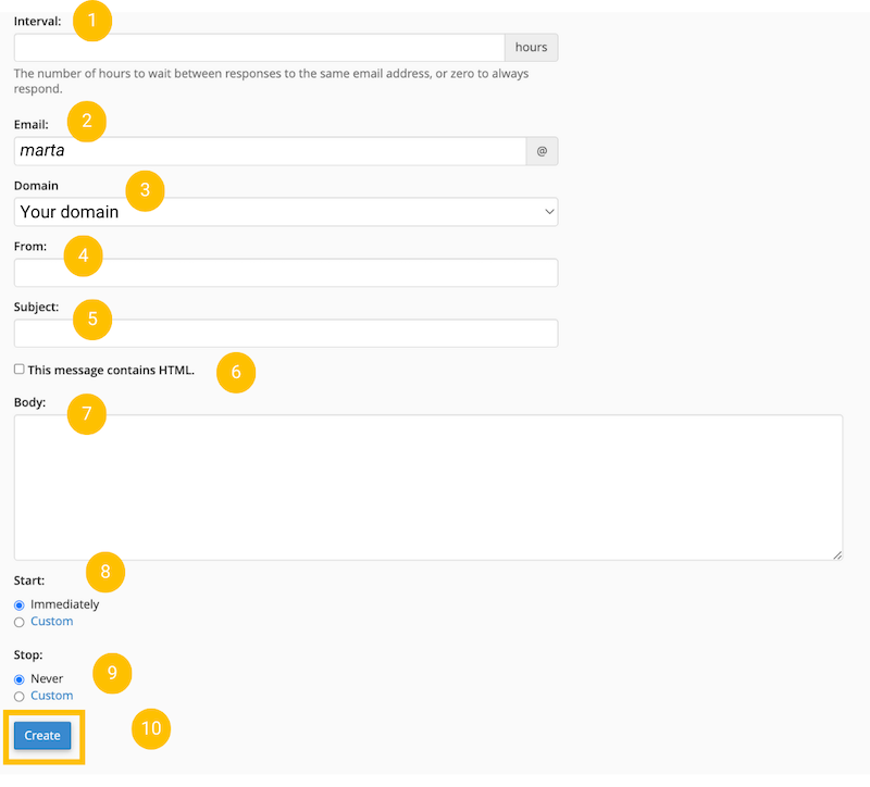 3. Domain: Select the domain to which you want to add the automatic response email. If you only have one domain, it will remain in this field by default.