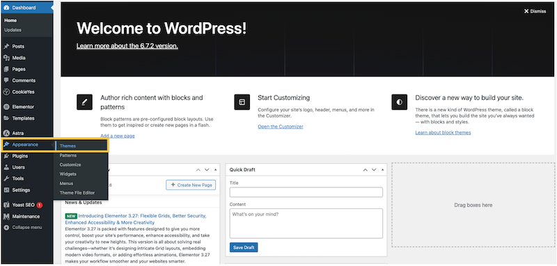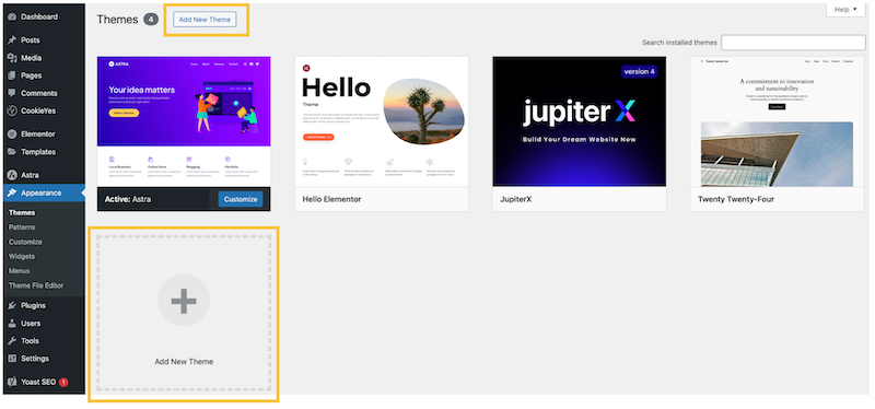 Lai pievienotu jaunu Tēmu, kreisajā navigācijas joslā izvēlieties iespēju "Appearance" jeb "Izskats" un tad izvēlieties apakšizvēlni "Themes" jeb "Tēmas".