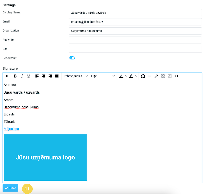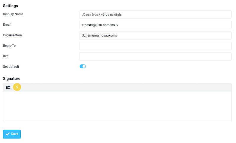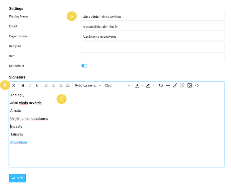 6. Šeit Jūs varat koriģēt savu vārdu, uzvārdu uzņēmuma nosaukumu u.c. šajos laukos varat ierakstīt informāciju, kuru vēlaties atspoguļot, kad e-pastu saņems persona, kurai to nosūtāt.