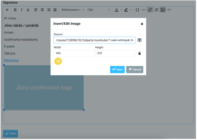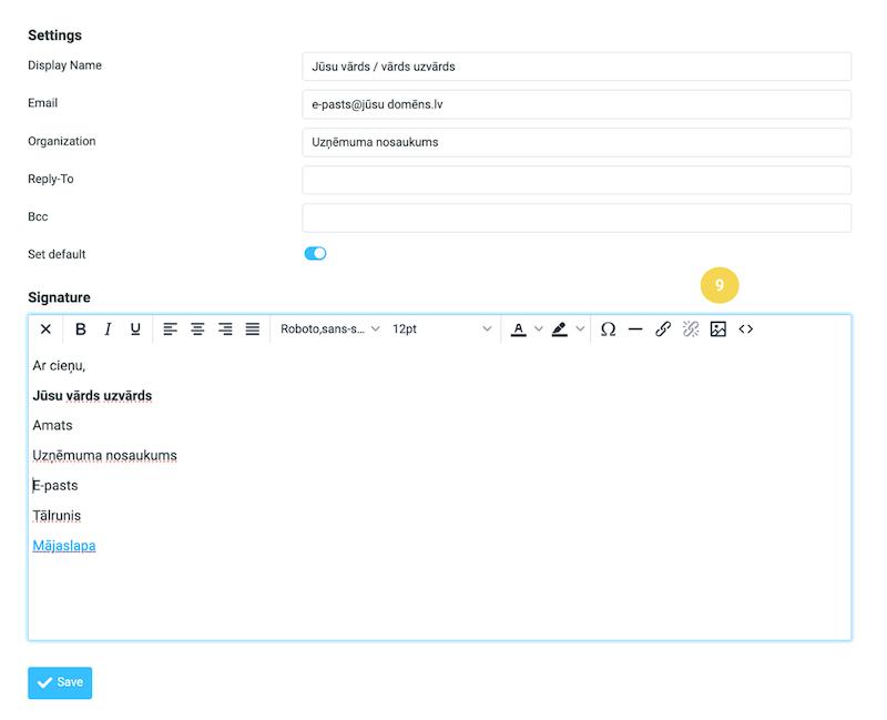 9. Lai pievienotu parakstam attēlu - logo vai akcijas/ pasākuma baneri u. c., izvēlieties attēla ikonu.